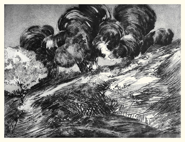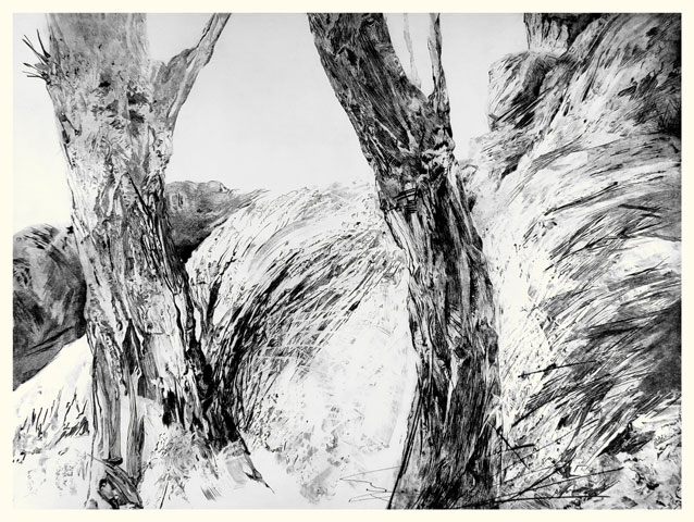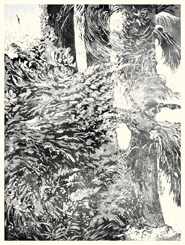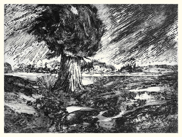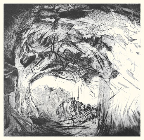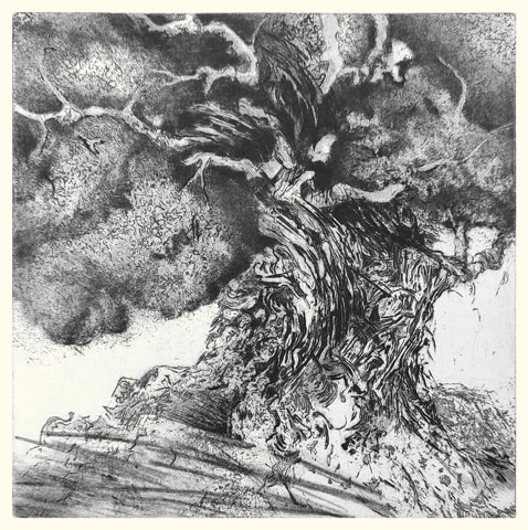Si Annie Helsly grave depuis maintenant plus de dix ans, elle dessine depuis toujours. Diplômée de l'École nationale supérieure des Arts Décoratifs, architecte de métier, muséographe et scénographe d'expositions, son expérience l'a initiée à toutes les relations plastiques et visuelles à l'espace. Le dessin vient toujours au commencement de la gravure, sur le motif, en pleine nature du littoral breton où elle vit. Arbres au balancement souple, feuillages ramifiés contre le ciel, herbes folles aux forts contrastes d'ombre et de lumière, puissance minérale des rochers, l'observation du paysage, entre l'œil et le crayon, se voit reversée sur la plaque métallique en une libre recomposition intérieure qui avance dans l'inconnu des masses, des stries, des réserves, des griffures, des valeurs tantôt poussées à leur paroxysme, tantôt atténuées jusqu'à l'effacement. Chaque gravure d'Annie Helsly est alors un voyage commencé au dehors, poursuivi en elle-même, guidé par le trait et le jeu des matières, afin d'offrir à celui ou bien à celle qui s'y arrêtera l'éclat en noir et blanc d'un écho intime à toucher du seul regard.